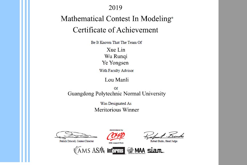 近日,2019年美国大学生数学建模竞赛与交叉学科数学建模竞赛(MCM&ICM)成绩揭晓。我校学子再创佳绩,夺得国际一等奖(Meritorious Winner)1项,国际二等奖(Honorable Winner)8项。