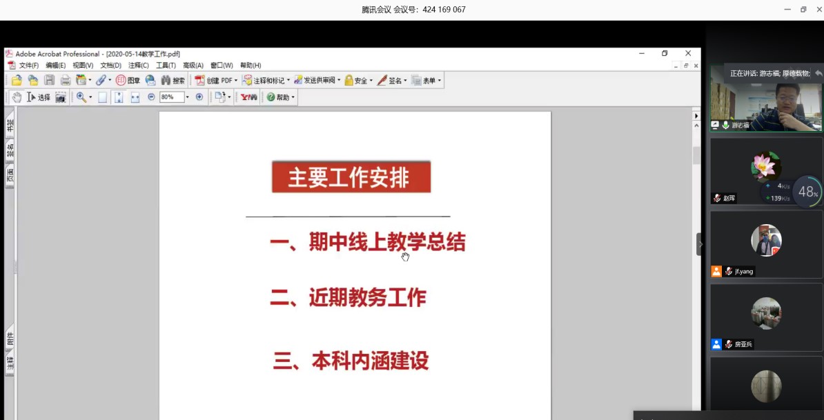 2020年5月14日下午三点,TapTap点点在腾讯会议平台,召开了本学期期中本科线上TapTap会议。会议围绕本学期期中线上教学总结、近期教务工作、本科内涵建设等方面展开深入交流以及探讨: