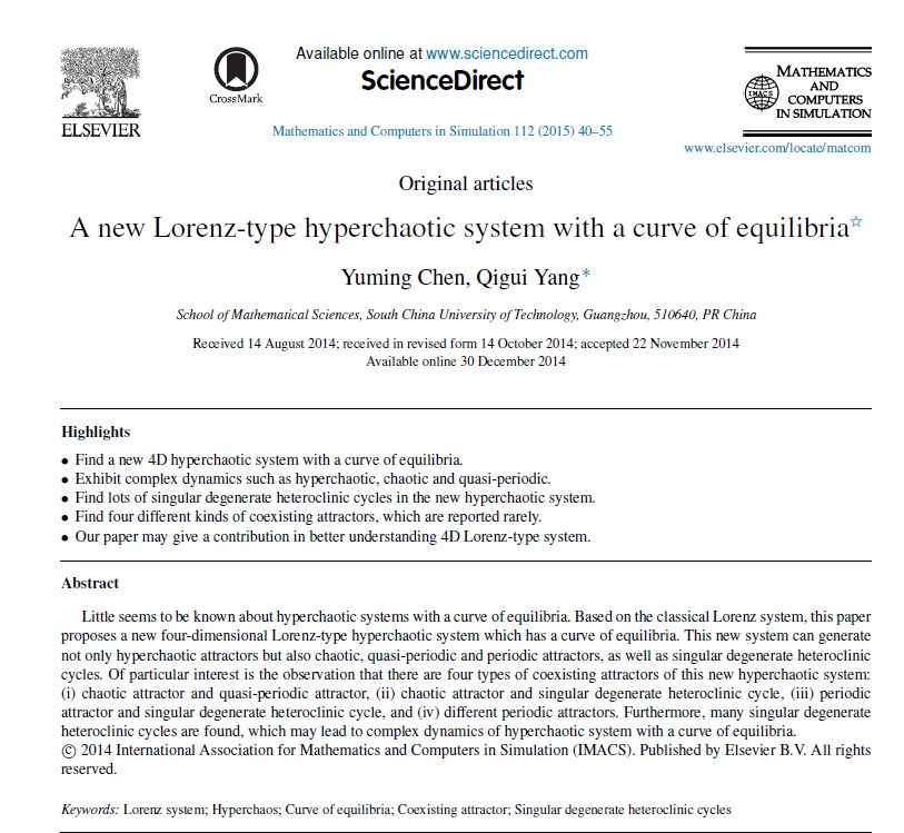 该论文题为《A new Lorenz-type hyperchaotic system with a curve of equilibria》,2015年发表在SCI期刊Mathematics and Computers in Simulation上。在该文中,作者采用反馈控制方法,找到了一类具有平衡点曲线的四维超混沌系统,证明了该系统无穷多奇异退化异宿轨的存在性,并研究了多种类型的多稳定性现象。论文研究方法新颖,得到的结论丰富了超混沌系统的理论,受到了国内外同行的关注。