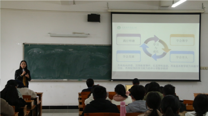 会议开始,数学系主任黄凤英首先对同学们实习过程中的表现给予充分肯定,其次她对同学们在实习过程中存在的问题进行了反思,最后她对这批即将走上教师岗位的毕业生提出如下三点期许:有规划、有积累、有选择。