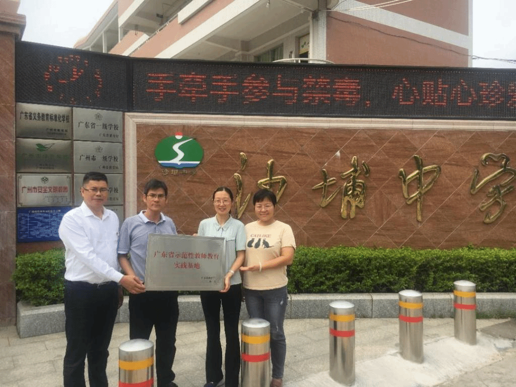 座谈会结束后,两所学校主要领导共执“广东省示范性教师教育实践基地”牌匾在沙埔中学门口合影。本次走访沙埔中学不仅使得学院能够准确、及时的掌握实习生的实习情况,还进一步拓展了学院和沙埔中学的合作形式,成功实现院校共赢,同时也为学院今后发展与更多院校的深度合作提供了经验和示范。