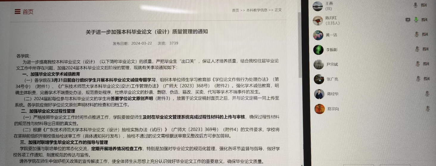 2024年3月29日,TapTap点点召开2024届本科毕业论文(设计) 工作专题线上会议,会议由学院教学副院长陈月红主持,学院毕业设计工作小组全体成员和教务员参加本次会议。陈院长首先向与会小组成员传达学校关于加强本科毕业论文(设计)质量管理的最新通知,强调加强毕业论文学术诚信教育和加强毕业论文过程性管理。