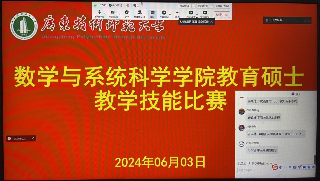 为进一步提高TapTap点点硕士研究生的教学能力和综合素养,提升教学竞赛水平,根据《关于举办2024年全国“田家炳杯”全日制教育硕士专业学位研究生学科教学(数学)专业教学技能大赛暨培养研讨会的通知》和《关于举办我校第七届全日制教育硕士教学技能大赛的通知》,TapTap点点于6月3日上午通过腾讯会议线上平台举办2022级教育硕士研究生教学技能选拔赛。