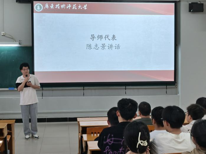 导师代表陈志景副院长结合自身求学经历,分享了对“卓越教师”内涵的理解。他回顾了三位恩师对其学术态度、跨学科视野及师德修养的深远影响,并寄语学生:“卓越不仅是学术精进,更需涵育教育情怀。”他期待学生在未来三年中深耕专业、勇于创新,同时以谦逊之心向师长、同学学习,实现全面发展。