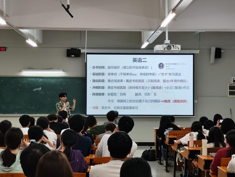 考研经验交流会上,2025届成功考取研究生的5位优秀学生代表依次上台分享考研经验。5位同学从时间规划切入,分享了自己制定的“基础 - 强化 - 冲刺”三阶段复习计划,着重介绍了专业课、英语、政治和教育学的复习方法,推荐了实用的复习资料与线上资源。他们还结合备考过程中的心态调整、压力释放等方面,毫无保留地分享自己的成功做法,为学弟学妹们提供了宝贵经验。分享结束后,现场设置自由交流环节。22级同学纷纷就自身关心的问题与学长学姐展开深入交流。