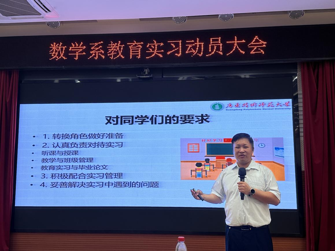 数学系副主任黄术在会上介绍了本次教育实习的安排与特点,并对学生提出实习要求:一.要迅速转换角色,做好心理和专业准备;二.要认真负责,珍惜实践机会,提升教学能力和职业素养;三.要积极配合学院管理,严格遵守实习纪律;四.要妥善解决实习中遇到的问题;五.鼓励积极报名参加粤东、粤西、粤北地区(如仁化、河源等地)实习点,为当地教育贡献力量,同时拓宽视野和职业发展路径。