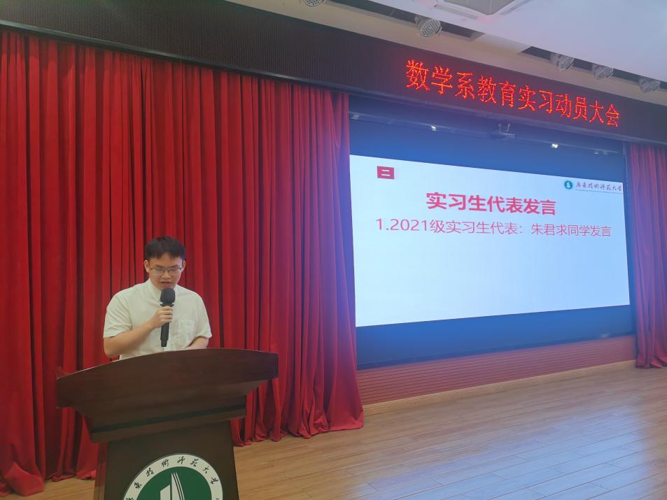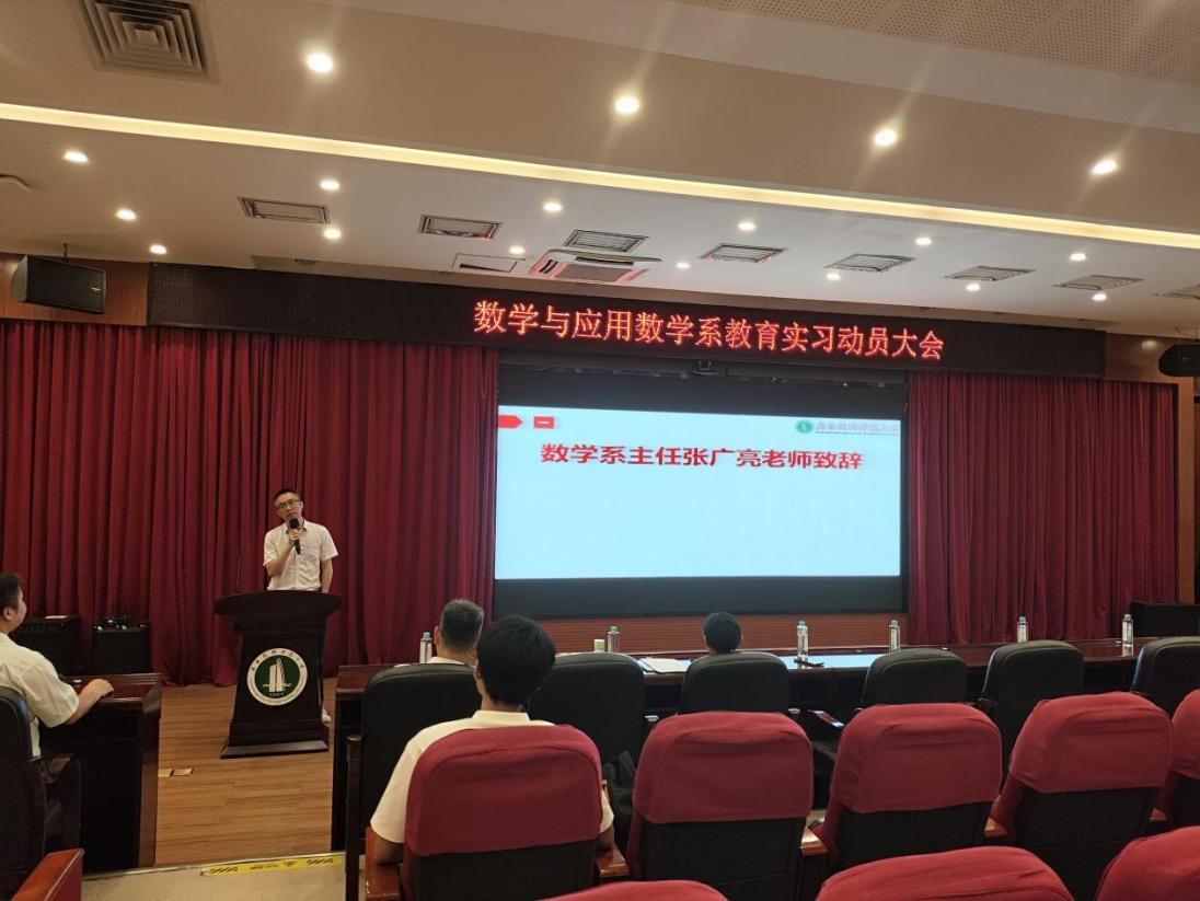 数学系主任张广亮在发言中强调实习是师范生走向岗位前的宝贵历练,鼓励学生积极参加粤东、粤西、粤北地区实习,拓宽视野。他提醒大家注意实习纪律和自身安全,希望同学们保持积极态度,注重团队协作,珍惜机会,积累经验,提升教学技能,展现我校学子的良好风貌,为未来职业发展打下坚实基础。