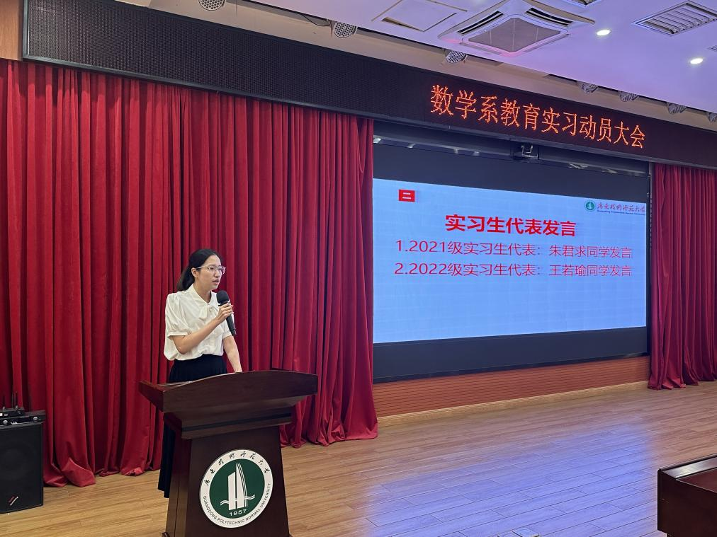 2022级实习生代表王若瑜在发言中倡议同学们在实习中注重提升自身素养。她强调要以高尚师德为准则,坚守教育初心;通过实践锤炼专业技能,提升教学水平;以爱心和耐心对待学生,助力成长。她呼吁同学们以优秀教育工作者为榜样,努力磨砺自我,为未来职业发展打好基础。