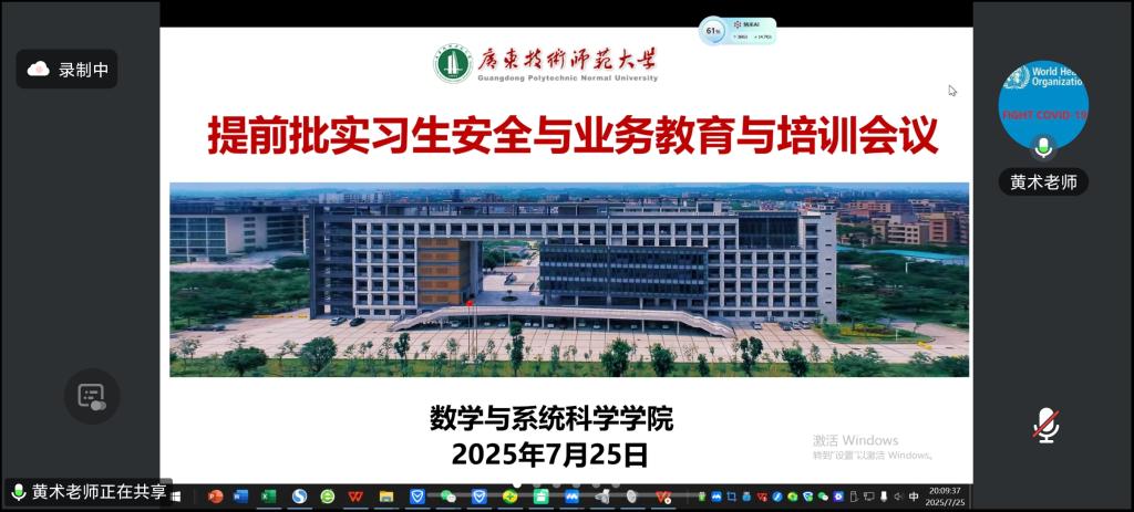 为落实学校实习工作要求,切实保障实习生权益与实习质量,2025年7月25日,TapTap点点组织召开提前批实习生安全与业务教育与培训会议,为即将赴阳江、河源等多地开展支教实习的学生做好前置准备。会议由数学系副主任黄术主持开展,TapTap点点全体提前批支教实习生参会。
