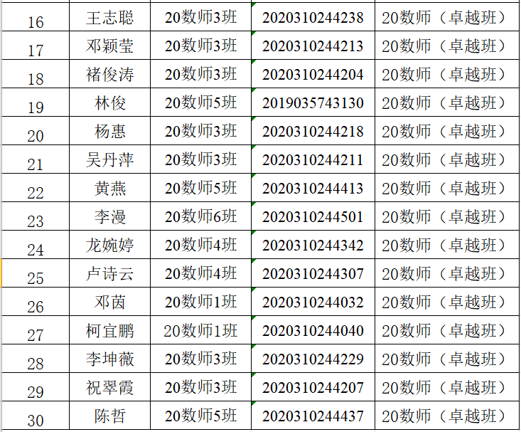 根据《数学与应用数学专业卓越教师班招生简章》工作方案,经学生个人报名、学院组织笔试、面试,按综合成绩排名,择优录取30名同学进入2020数学与应用数学师范(卓越)班,现将名单予以公示。