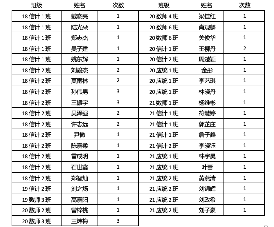 学校为了打好新冠肺炎疫情防控战,全面、及时、准确掌握全校师生的健康状况,要求全校师生严格执行每天按时登录学校企业微信完成个人健康信息填报工作。18、19、20级同学在7月19日-9月15日以及21级同学在9月11日-9月15日的企业微信健康信息填报中,以下同学有未填报企业微信健康信息的情况,现进行全院通报批评。