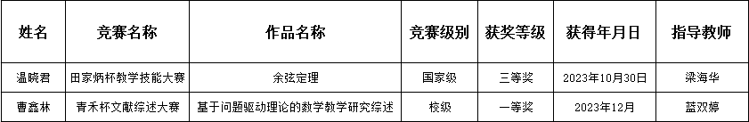 根据《关于开展2023年广东技术师范大学研究生优秀学科竞赛奖励评审工作的通知》(广师大研〔2024〕8号),经学院硕士研究生导师评审会议讨论通过。拟上报2021级温晓君、2022级曹鑫林参选。现予以公示: