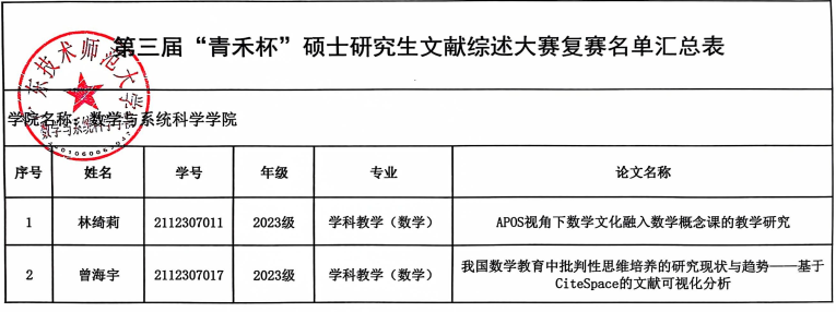 根据《关于举办广东技术师范大学第三届“青禾杯”硕士研究生文献综述大赛的通知》(广师大研[2024]39号),经学院选拔,拟上报2023级林绮莉、曾海宇参加第三届“青禾杯”硕士研究生文献综述大赛复赛。现予以公示: