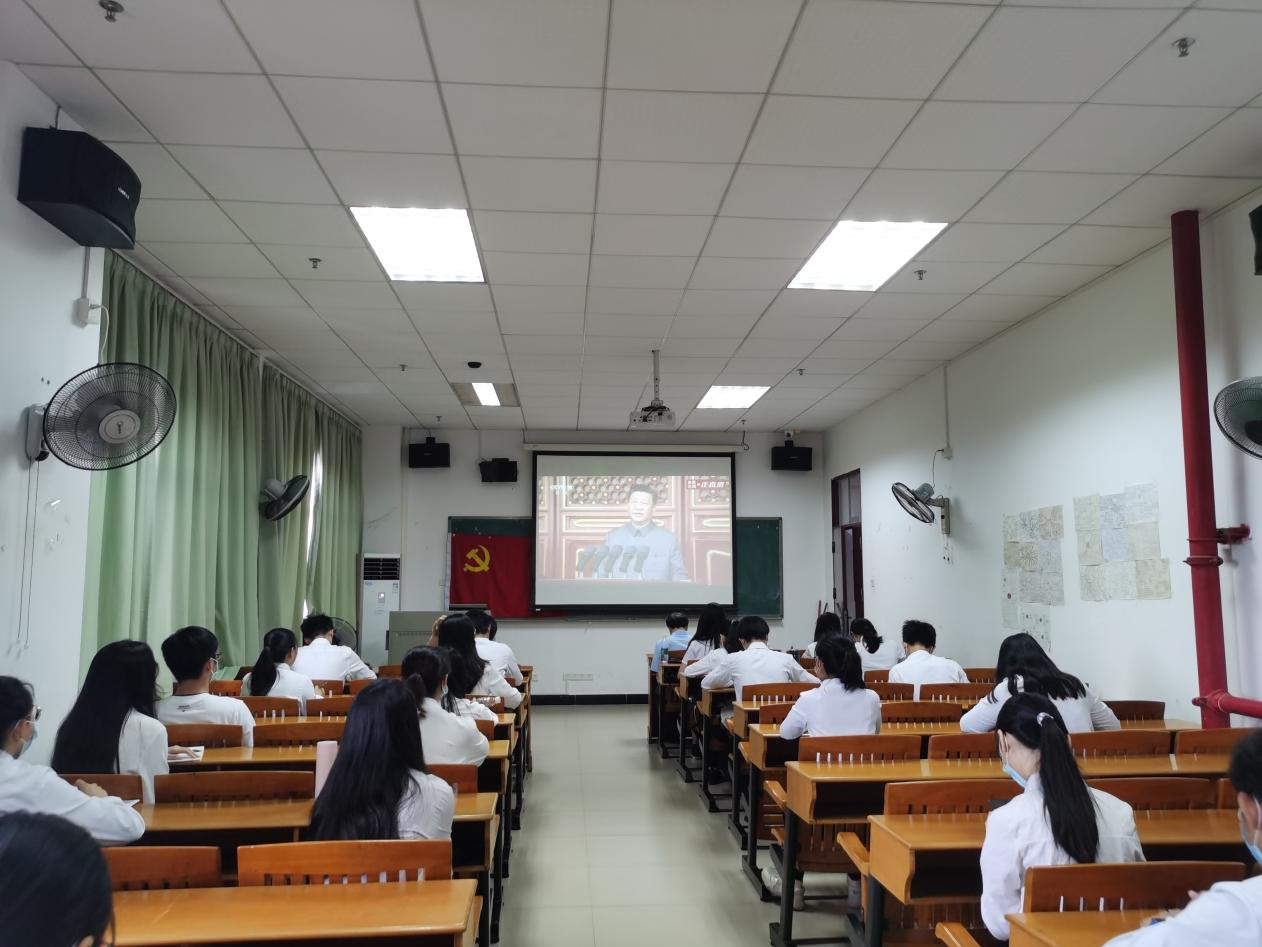 随着战斗机列出“100”和“7.1”的阵型,庆祝大会拉开了序幕,全体学生党员、入党积极分子跟随直播的脚步,全体起立唱国歌,紧接着聆听中共中央总书记、国家主席、中央军委主席习近平发表重要讲话。习近平总书记代表党和人民庄严宣告,经过全党全国各族人民持续奋斗,我们实现了第一个百年奋斗目标,在中华大地上全面建成了小康社会,历史性地解决了绝对贫困问题,正在意气风发向着全面建成社会主义现代化强国的第二个百年奋斗目标迈进。全场一片欢呼。初心易得,始终难守。以史为鉴,可以知兴替。我们要用历史映照现实、远观未来,从中国共产党的百年奋斗中看清楚过去我们为什么能够成功、弄明白未来我们怎样才能继续成功,从而在新的征程上更加坚定、更加自觉地牢记初心使命、开创美好未来。习近平总书记说:“中国共产党立志于中华民族千秋伟业,百年恰是风华正茂!直播结束后,师生感触良多,党员同志纷纷表示将不忘初心、牢记使命,努力奋斗,砥砺前行,为中华民族伟大复兴作贡献,展现新时代青年的担当!(王婷婷)