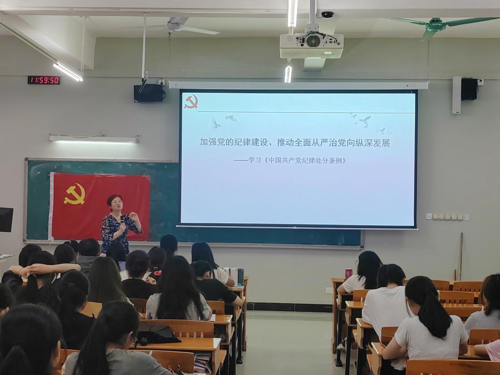 白雪飞书记详细讲述了《条例》的修订过程,《条例》的修订严格落实党的二十大关于坚持和加强党的全面领导和党中央集中统一领导的各项部署要求,进一步严明政治纪律和政治规矩;是实现和其他党内法规、国家法律相衔接的生动体现。她重点从此次《条例》修订内容中与自身工作密切相关的几个方面讲述心得体会。白雪飞书记强调,党员干部要学懂悟透《条例》内容,时刻绷紧政治纪律这根“弦”,一是要准确认识到学习《条例》是为了更好地遵守党的纪律,保持党的先进性和纯洁性,增强“四个意识”,坚定“四个自信”,做到“两个维护”;二是要规范政治言行,坚定理想信念,永葆政治本色。作为学生党员,不仅要学好专业技能,更要以身作则,起到先锋模范作用。