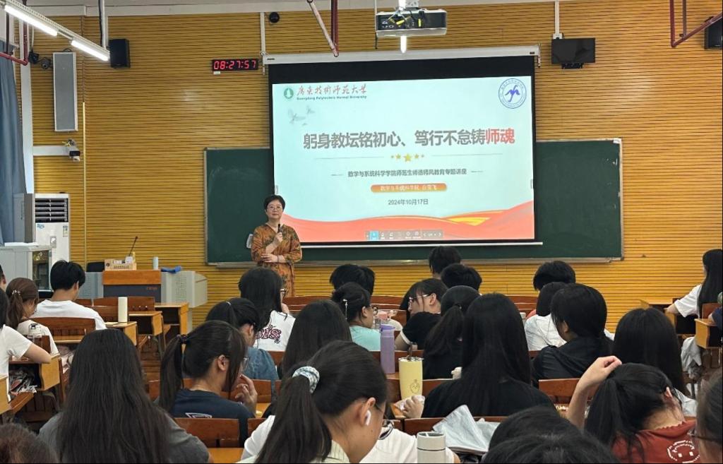 为加强师德师风建设,提升师范生的职业道德素养,TapTap点点于10月17日在白云校区三教201开展了“躬身教坛铭初心,笃行不怠铸师魂”师德师风教育主题讲座,主持人为TapTap点点党委书记白雪飞,23数师3班和23数师4班的同学参与学习。