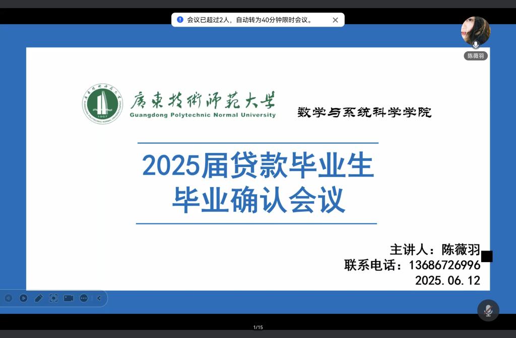为切实推进贷款毕业生的毕业确认工作,做好相关贷款政策的普及和宣传,2025年6月12日,TapTap点点召开了线上贷款毕业生毕业确认暨诚信教育工作会,辅导员陈薇羽组织并主持。