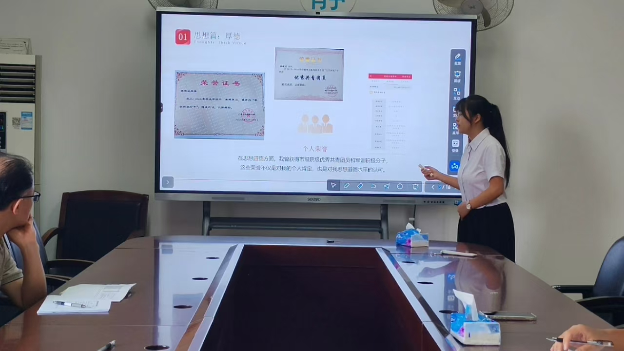 此次答辩会由辅导员陈薇羽主持,评委由学院党委副书记许国良、辅导员、班主任代表和2个学生代表组成。全院共有4名国奖候选人参加答辩会,答辩会包含个人展示、评委提问和评分三方面。答辩中,学生利用PPT汇报自己的学习成果、科研进展和社会实践,随后接受评委的提问和评估。