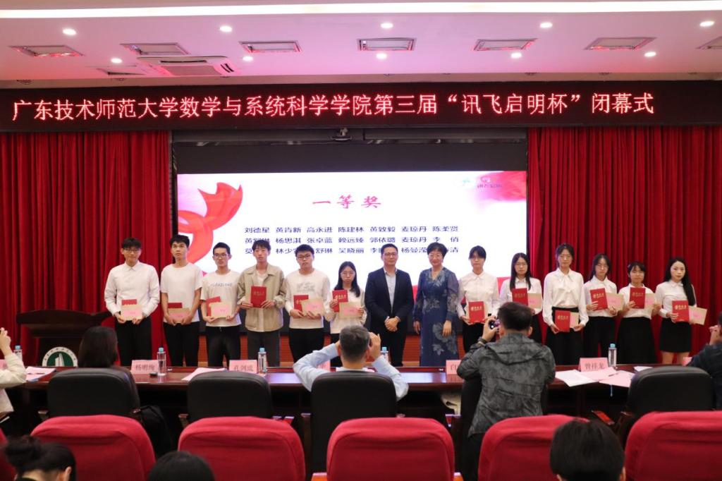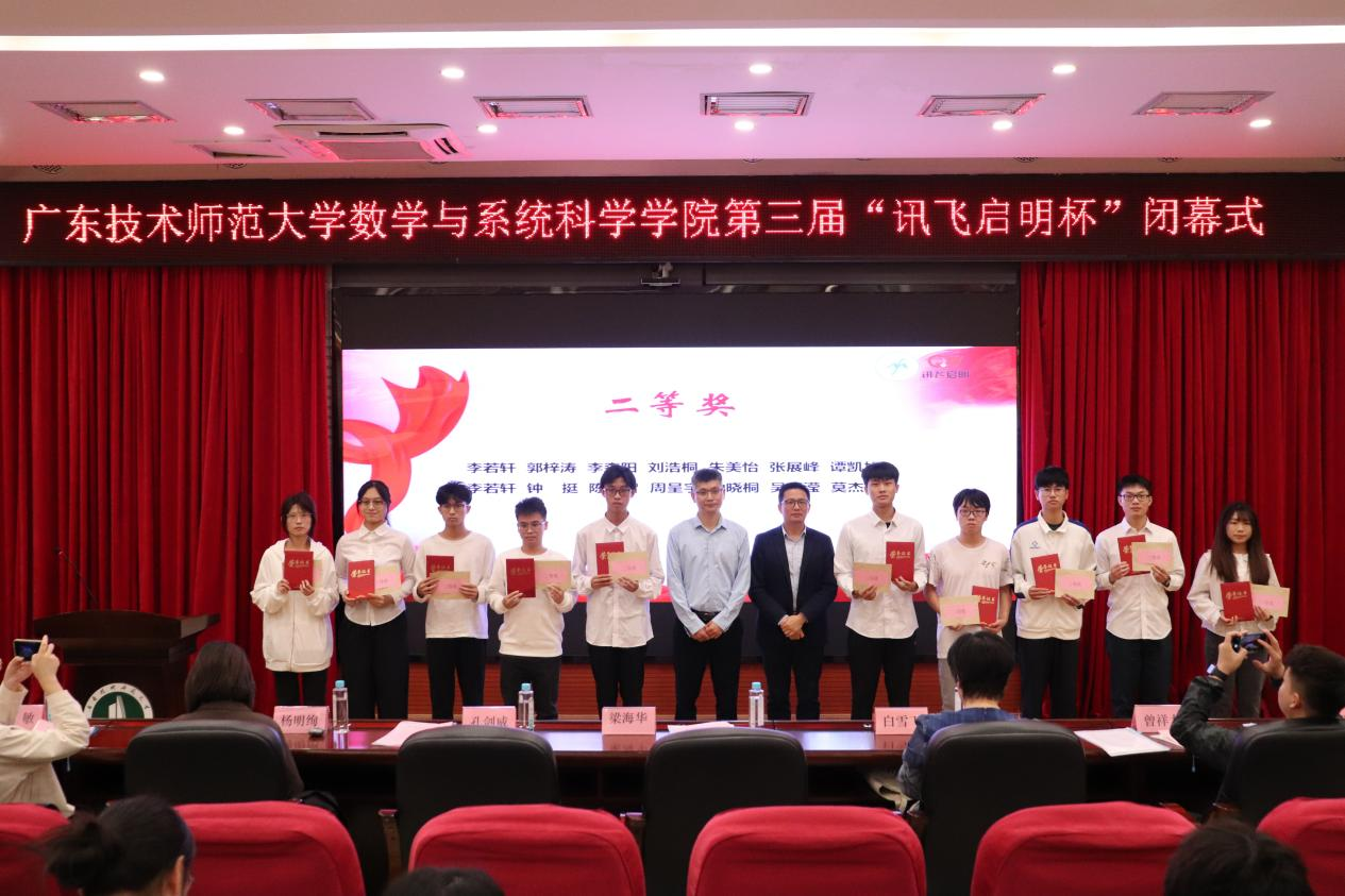 颁奖典礼上,孔剑威、杨明绚、白雪飞、梁海华等共同为获奖学生颁发获奖证书和奖金。获奖学生代表杨思淇发表感言,分享了个人的参赛经历和心路历程,并代表全体同学向赞助本次活动的广东讯飞启明科技发展有限公司和领导、老师们表示诚挚的感谢!她表示会坚定理想信念,常怀感恩之心,用奋斗擦亮青春底色,以行动书写使命担当,争做担当民族复兴重任的时代新人。